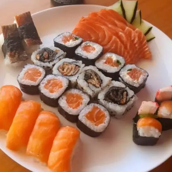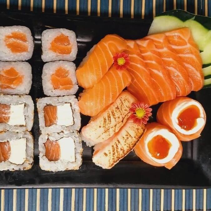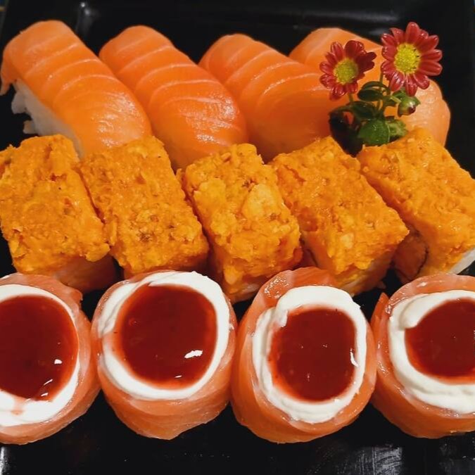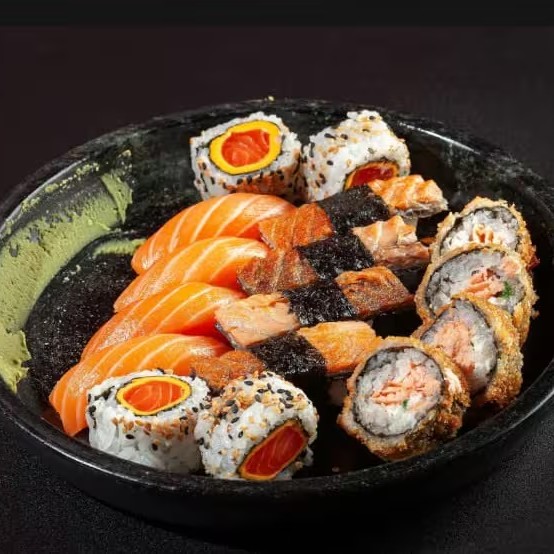 4 Niguiri de Salmão, 4 Niguiri Skin, 4 Hot Philadelphia, 4 Uramaki de Salmão com Cheddar.