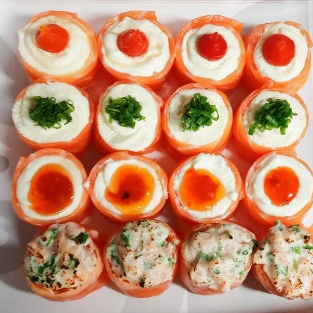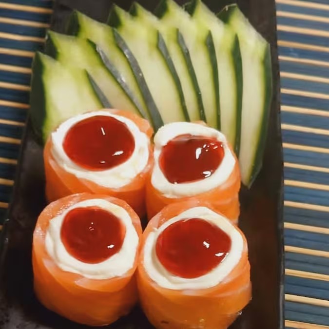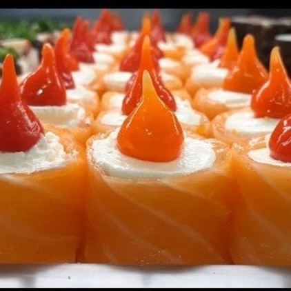 Fatia de salmão enrolado e maçaricado com recheio de cream cheasse e cobertura de geleia doce de pimenta, gergilim e cebolinha.
