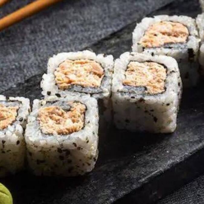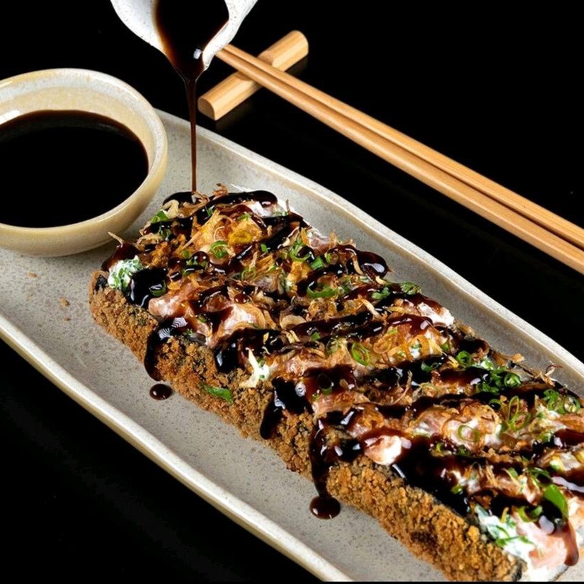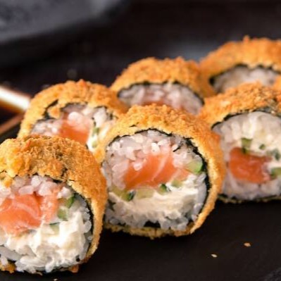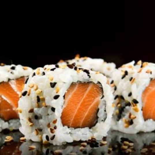 Sushi de salmão grelhado com cream cheasse envolto em alga marinha e arroz, finalizado com gergilim crocante.