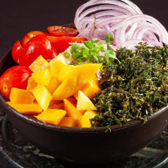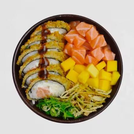 Poke Sushi Okayama feito com: Arroz, Tartar de Salmão, Manga, Cebola Roxa, Tomate Cereja, Sunomono e Crispy de Couve.