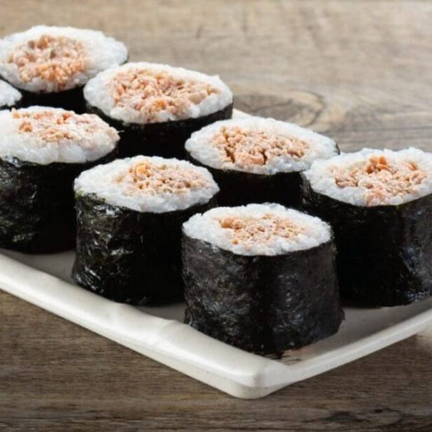 Sushi de salmão fresco envolto em arroz oriental e alga marinha.