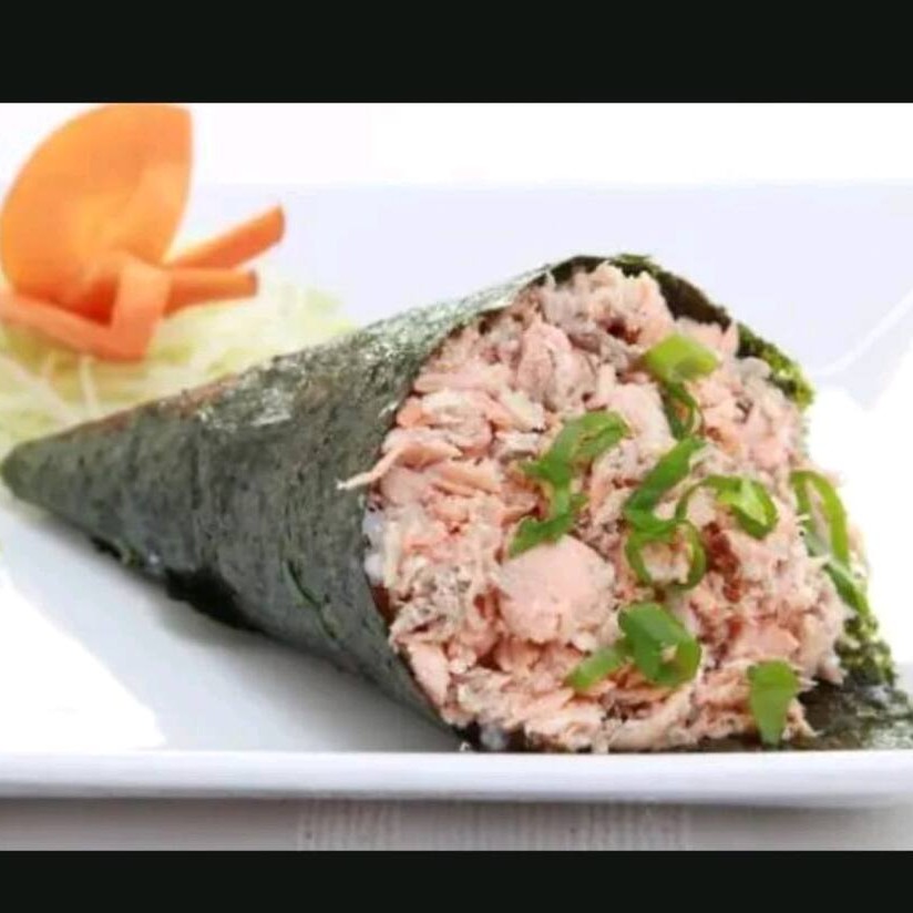 Temaki Hot Philadelfia ( arroz, salmão em cubos, cream chease e cebolinha) aproximadamente 180 gramas peso final.