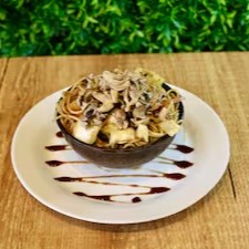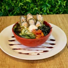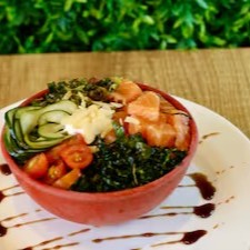 A Salada Bowl é um deleite colorido e nutritivo. Composta por crocantes folhas de alface crespa e alface roxa, combinadas com a picância sutil da rúcula. A adição de cenoura ralada traz um toque doce e terroso ao mix. Os tomates grape, frescos e suculentos, adicionam um sabor agridoce irresistível. O queijo minas, leve mas cheio de personalidade, complementa perfeitamente os ingredientes. Os croutons acrescentam uma textura crocante que contrasta maravilhosamente com a suavidade do salmão, que é a estrela desta salada, com seu sabor rico e textura delicada. É uma verdadeira explosão de sabores e texturas, criando uma experiência gastronômica incrível e saudável.