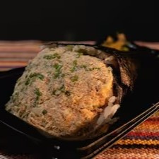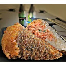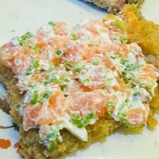 8 unidades. Arroz, salmão grelhado, alho poró, tempero do chef, empanado e frito