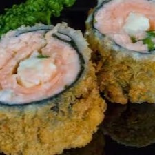Salmão, arroz, cebolinha, cream cheese, empanado e frito