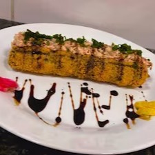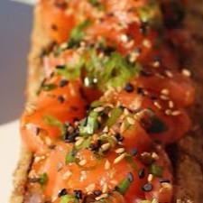 Salmão maçaricado cream cheese camarão cheese camarão empanado geléia de pimenta tarê