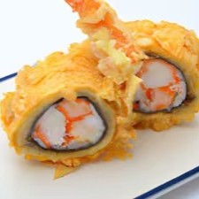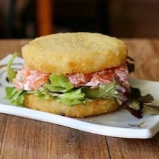 Pão especial feito de Arroz de Sushi, empanado. Salmão fresco Cream cheese alface sunomono