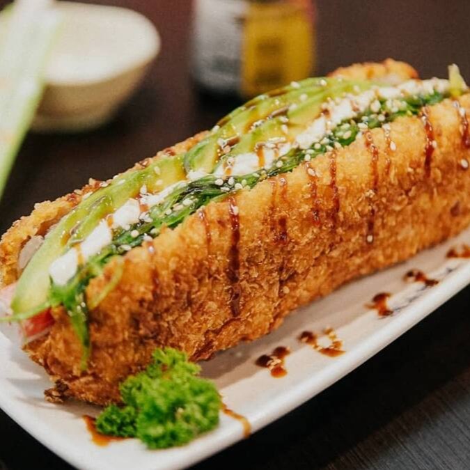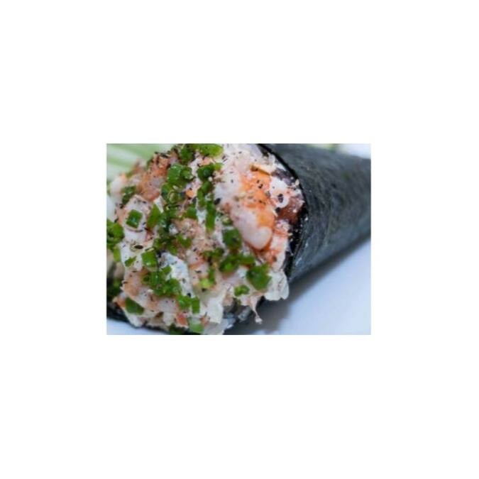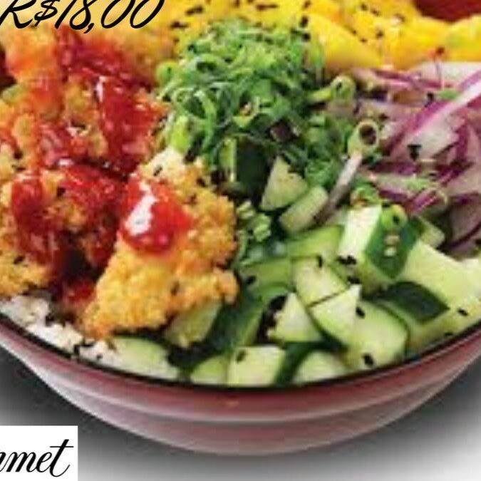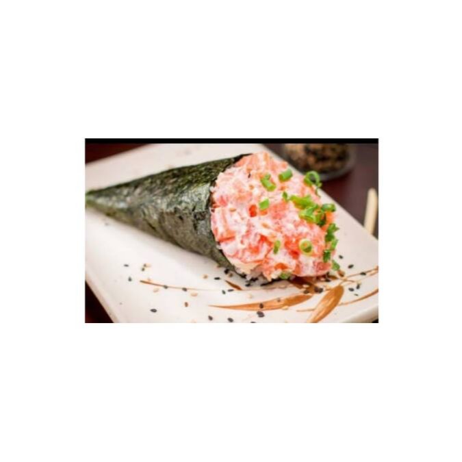 Cone com arros e salmão, passado na farinha e fritado no óleo de algodão