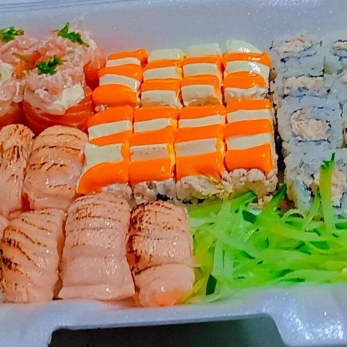 10 Gunkas,5 Sachimis,10 Niguirs De Salmão,10 De Peixe Branco, 05 Niguis De Camarao,05 Saschimi De Peixe Branco,5 Sashimi De Camarao.