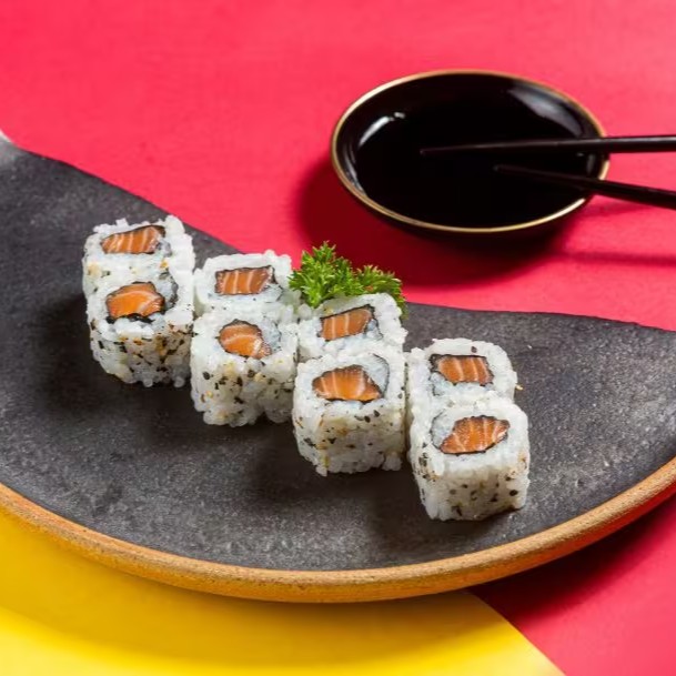 Roll de Arroz Gohan com Gergelim e Alga Nori com Recheio de Salmão
