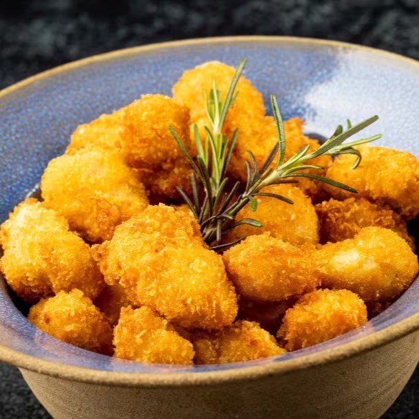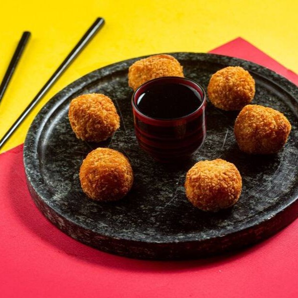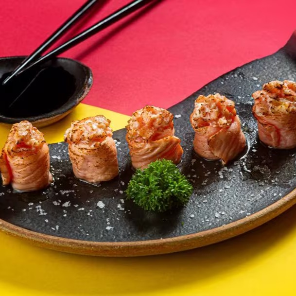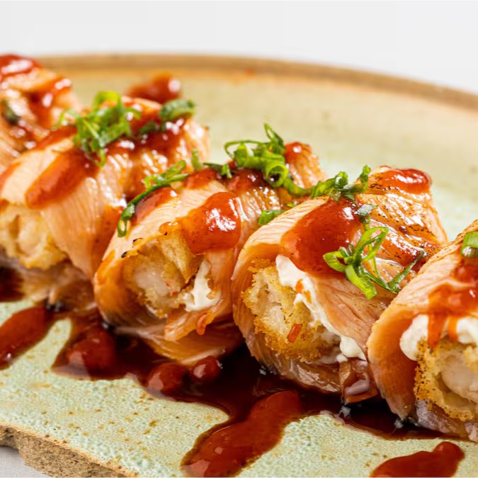 Camarões empanados e envoltos em cream cheese e salmão maçaricado servidos com delicioso molho de pimenta tailandesa e teriyake.
