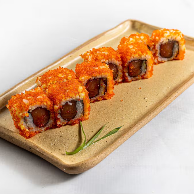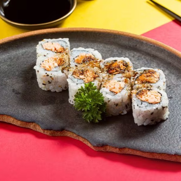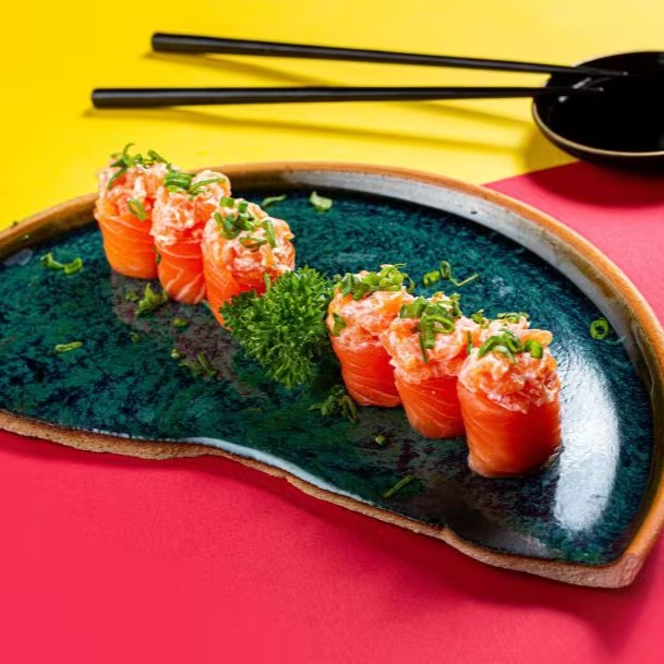 Sushi recheado com salmão, cebolinha e molho picante, envolto em massago.