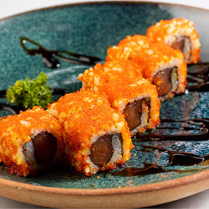 Sushi com recheio de atum, cebolinha e molho picante, envolto em massago.