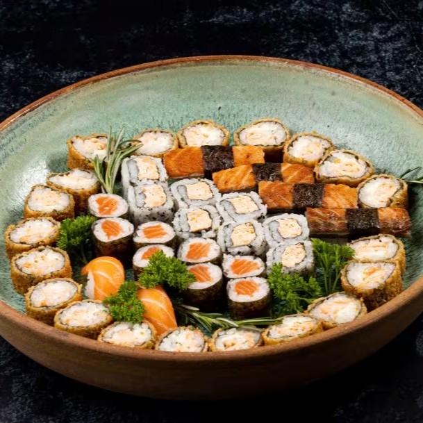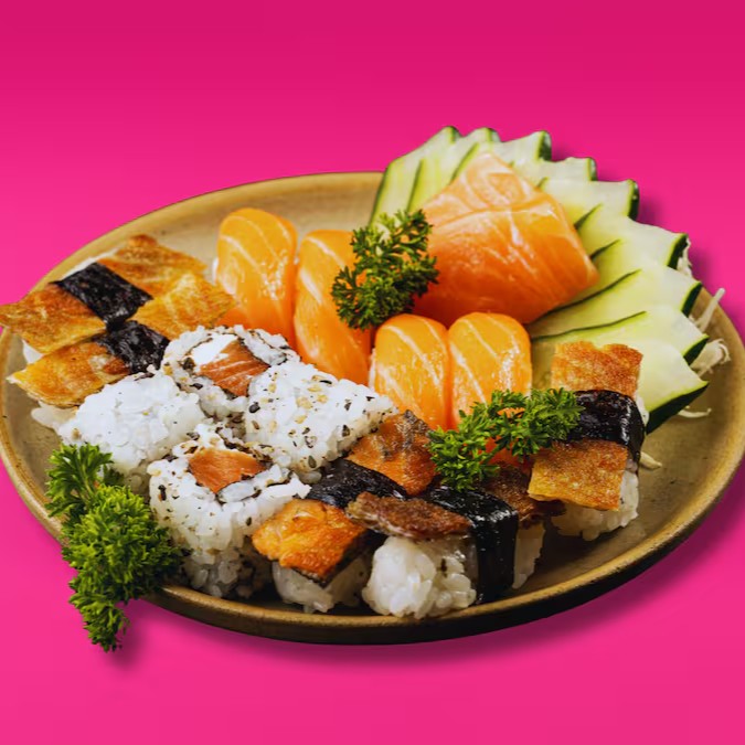 20 Maki Hot Filadélfia, 2 Sushis de Salmão, 8 Uramaki Skin, 8 Sakemaki e 4 Sushis Skin.