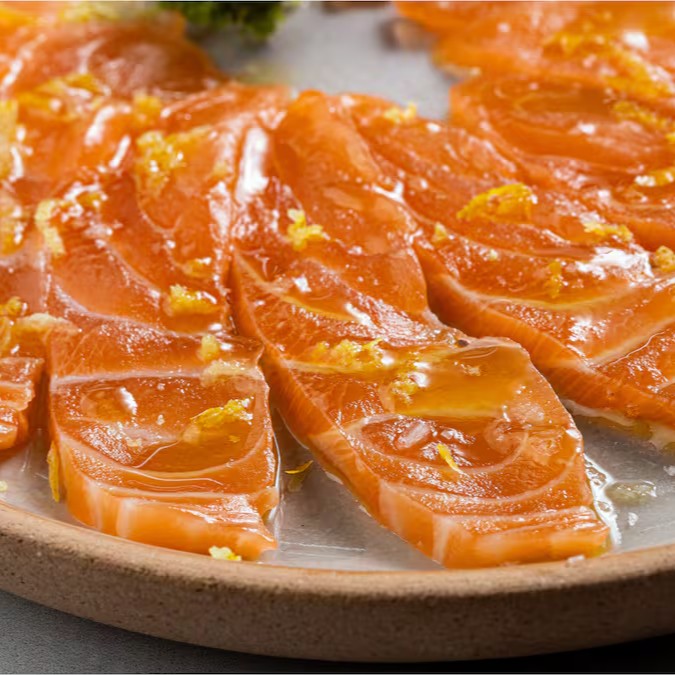 Fatias finas de salmão ao molho de azeite trufado e raspas de limão siciliano.