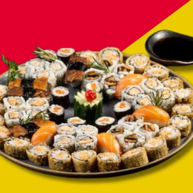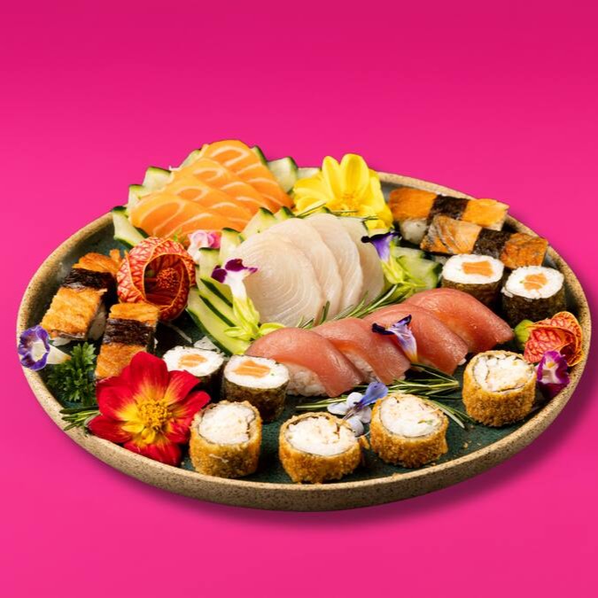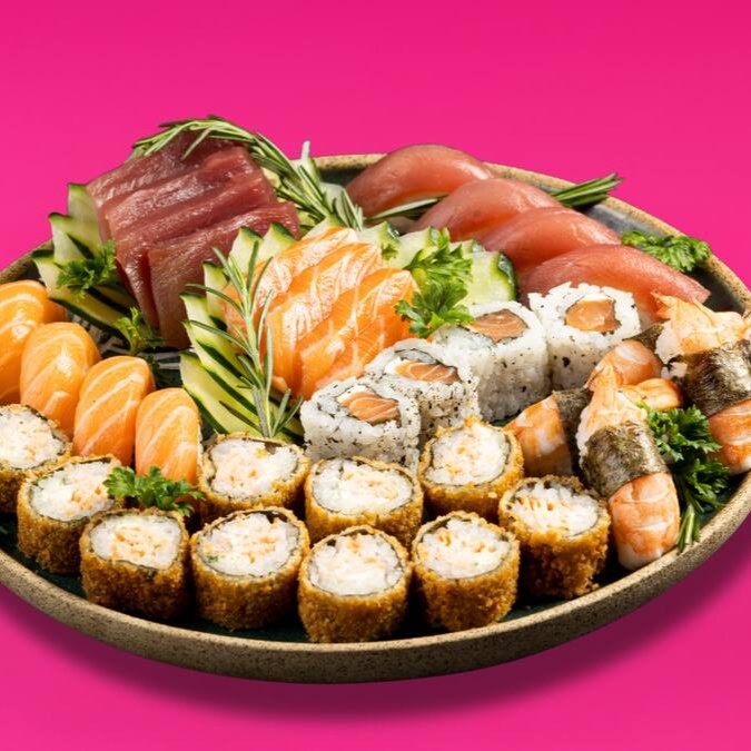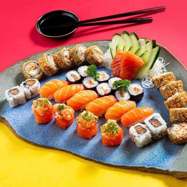 3 Sashimis de Salmão, 3 Sashimis de Atum, 4 Sushis de Salmão, 4 Sushis de Atum, 4 Sushis de Camarão, 4 Uramaki Filadélfia e 10 Maki Hot Filadélfia.