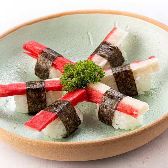 Fatia de kani com arroz por baixo.