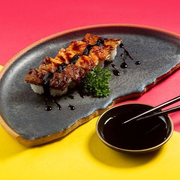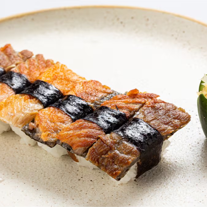 Niguiri de Pele de Salmão Grelhada - Arroz Gohan Coberto por Fatia de Pele de Salmão.