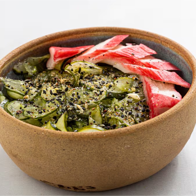 Saladinha refrescante de pepino com kani e gergelim.