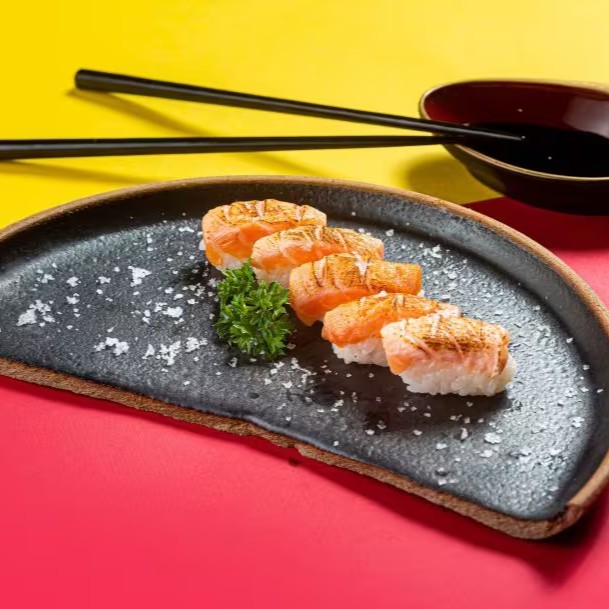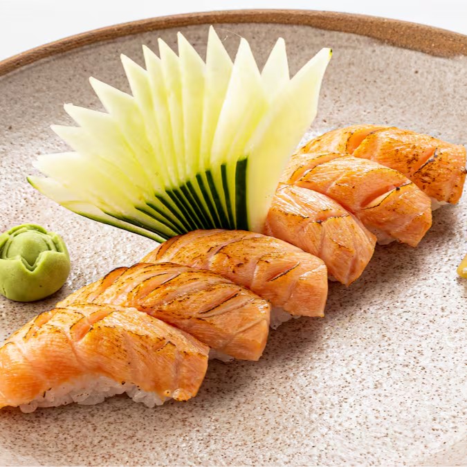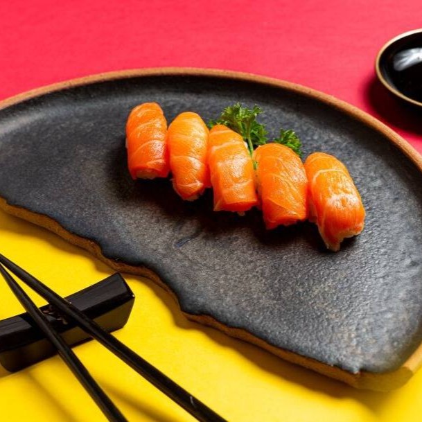 Niguiri de Salmão - Arroz Gohan Coberto por Fatia de Salmão Maçaricado com Azeite Trufado e Flor de Sal.