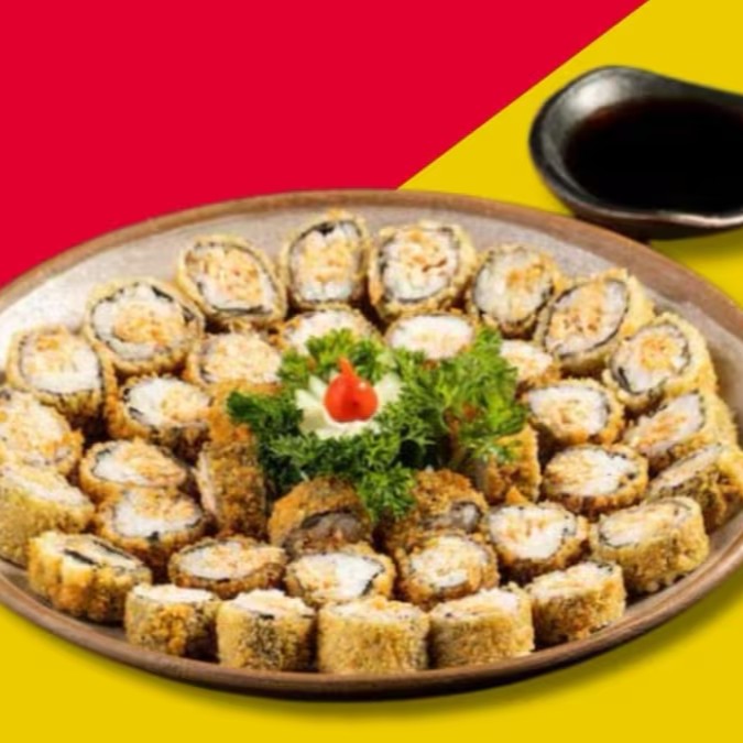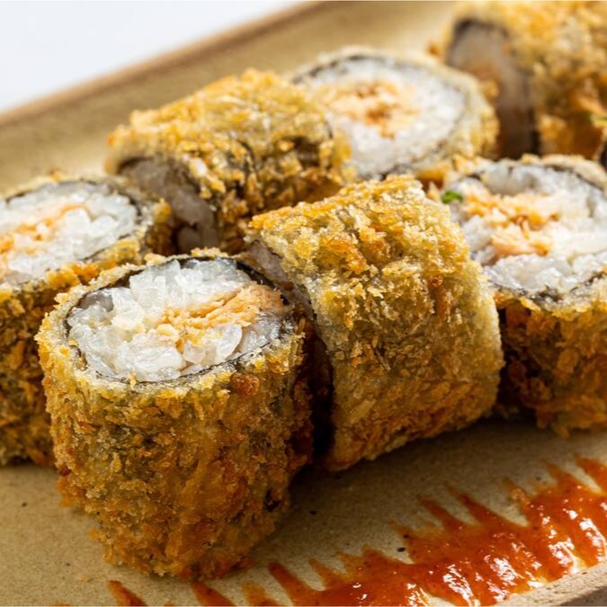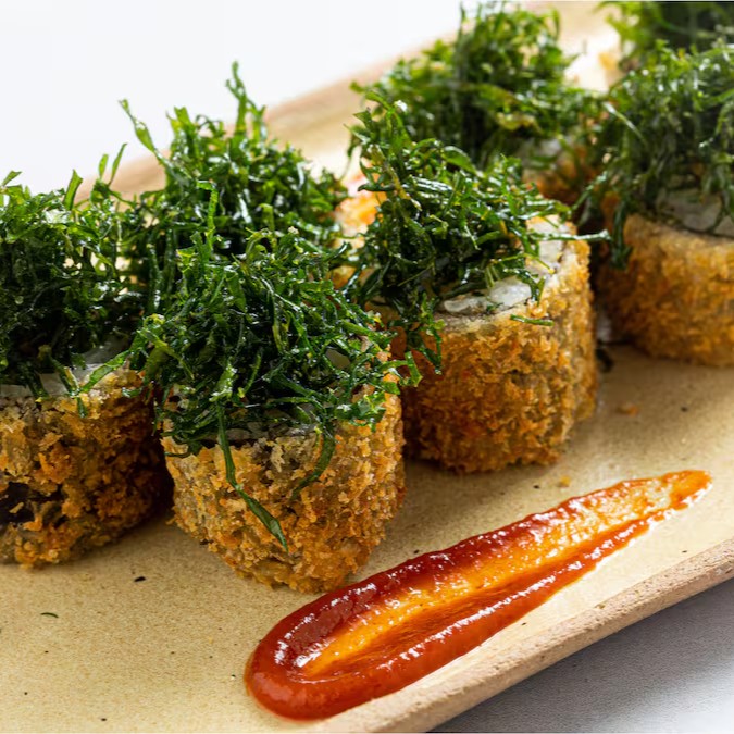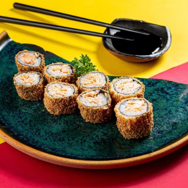 Sushi empanado, recheado com salmão, atum, kani e cream cheese, coberto com couve crocante.