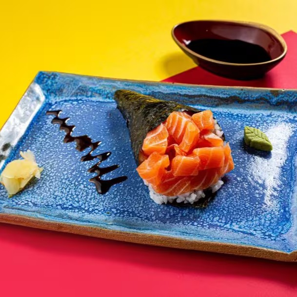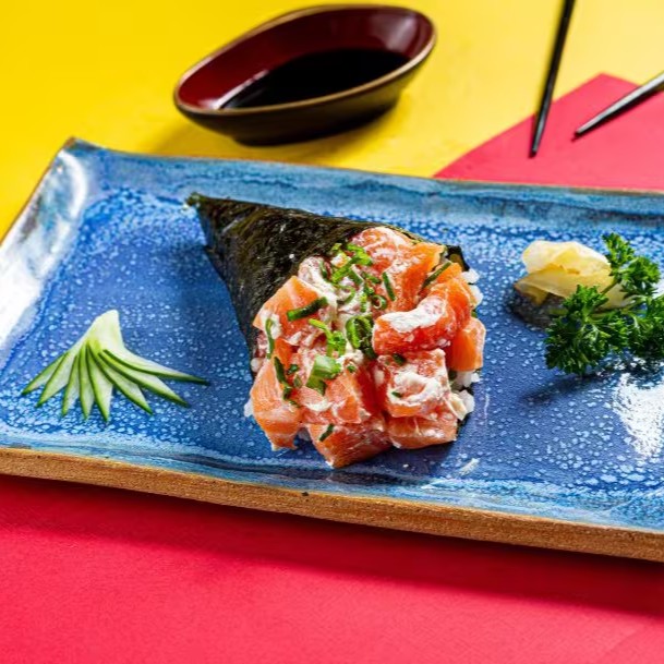 Cone de Alga Nori Recheado com Salmão, Cream Cheese e Arroz Gohan.