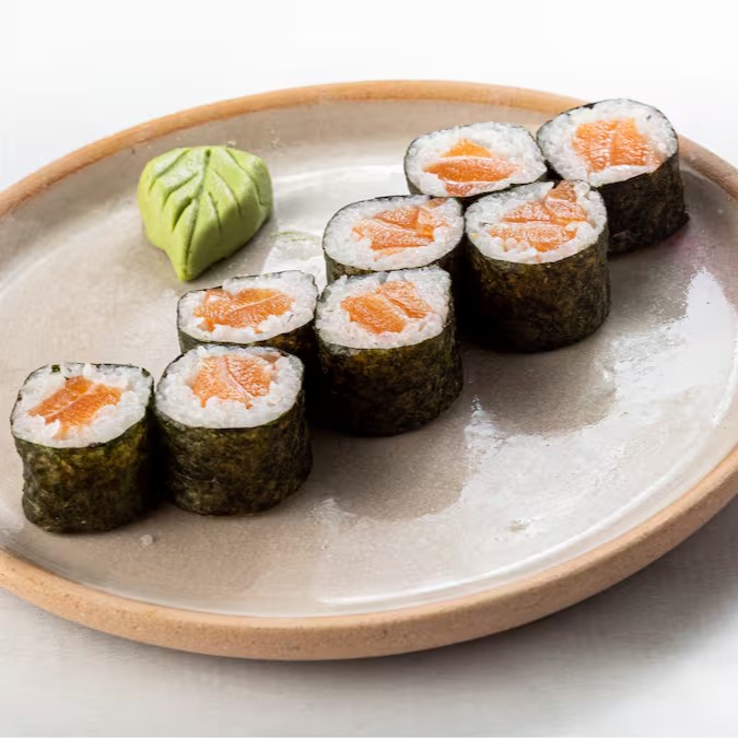 Salmão enrolado com alga por fora.