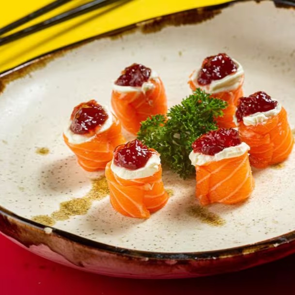 Sushi de Arroz Japonês Envolto por Fatia Fina de Salmão, Coberto com Cream Cheese e Geleia de Morango.