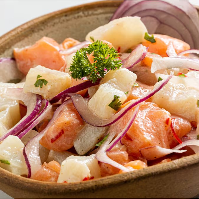 Tradicional ceviche de peixe branco e salmão, marinados no limão, cebola roxa e especiarias.