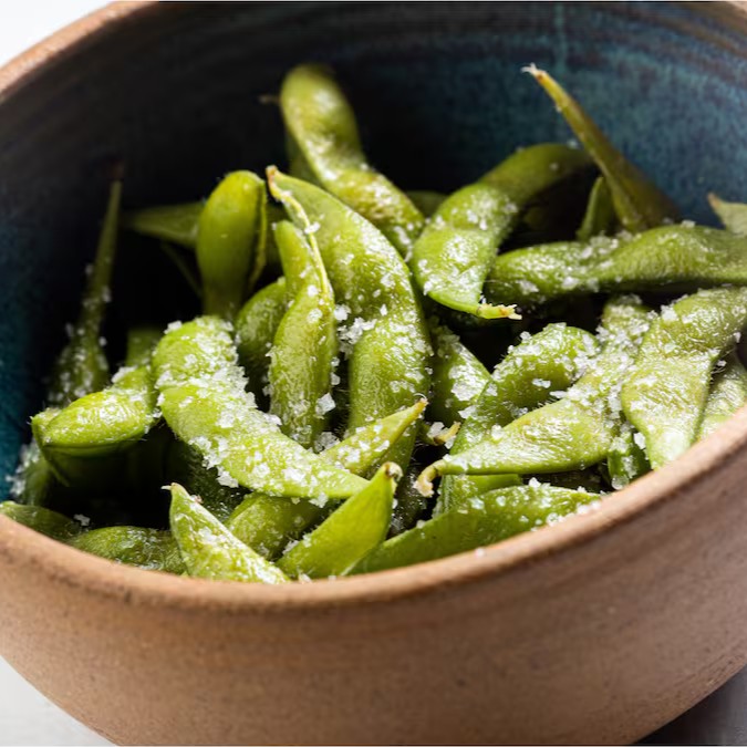 Vagem verde de soja cozida em especiarias e finalizada com flor de sal.
