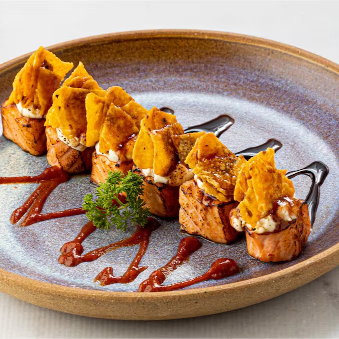 Cubos de salmão picante, maçaricados, cobertos por cream cheese e Doritos, acompanhado de molho teriyaki.