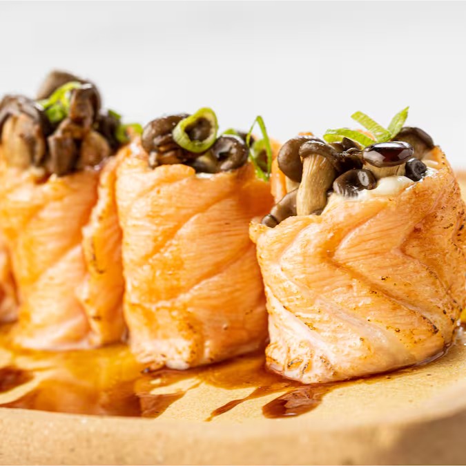 Roll de salmão e shimeji, grelhado com maçarico.