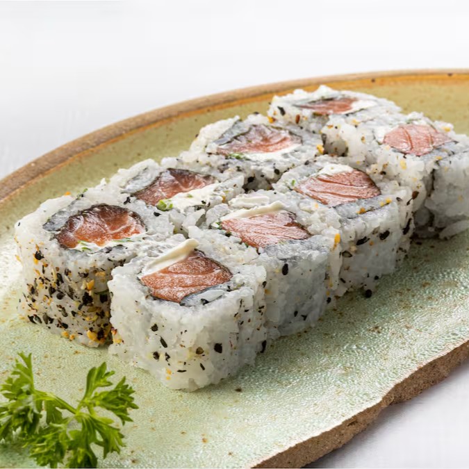 Roll de Arroz Gohan com Gergelim e Alga Nori com Recheio de Salmão e Cream Cheese.