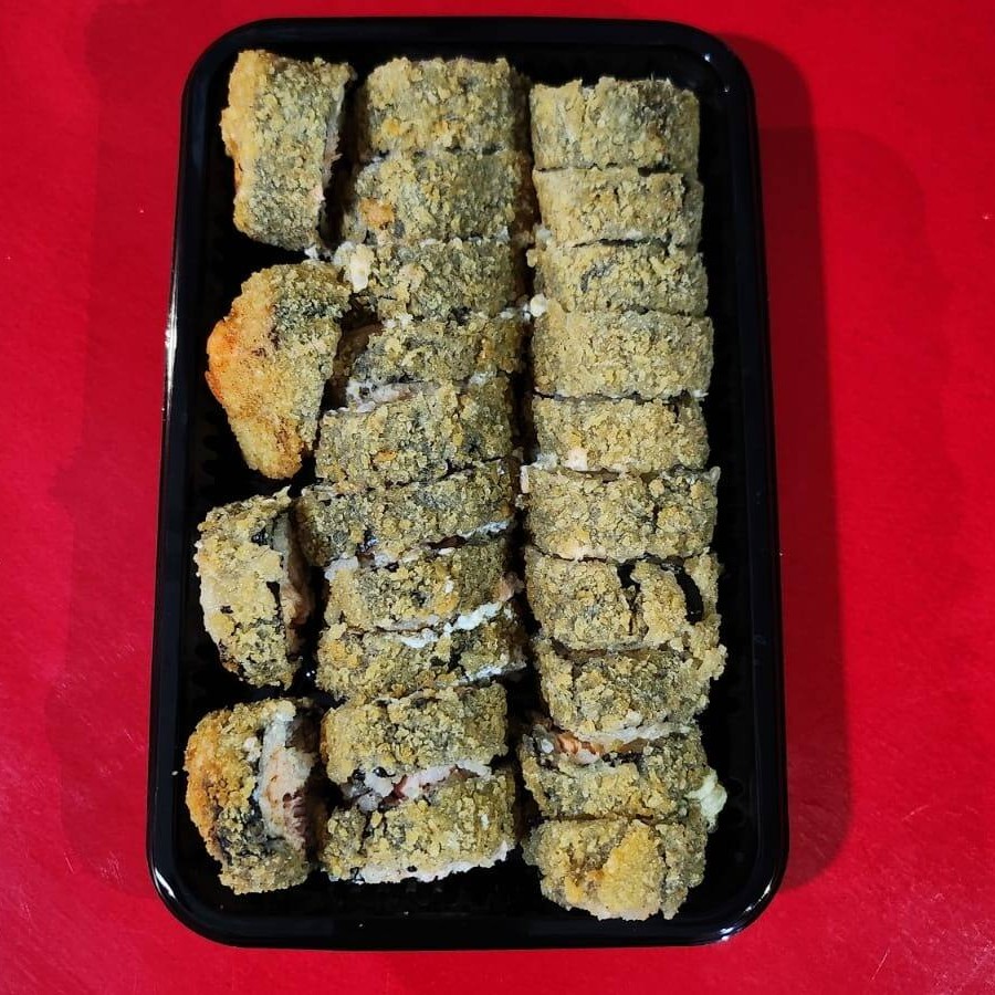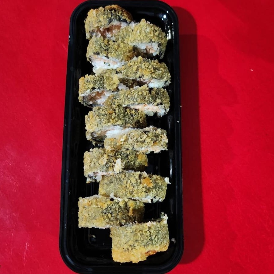 Alga, arroz japonês, salmão, cebolinha, creeam cheese, empanado na farinha panko e frito. Finalizado com couve. **Este item acompanha 1 hashi, 2 sachês de shoyu e 1 de teriaki.