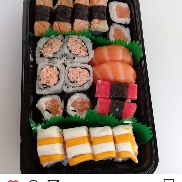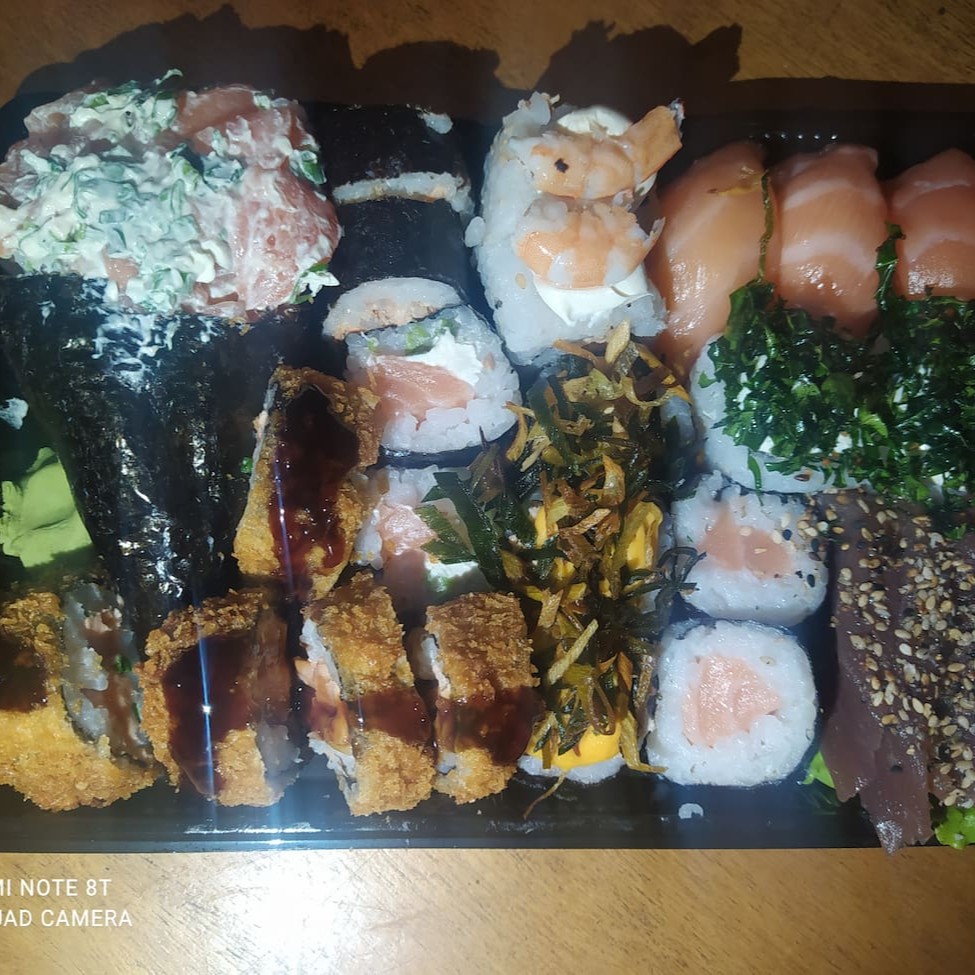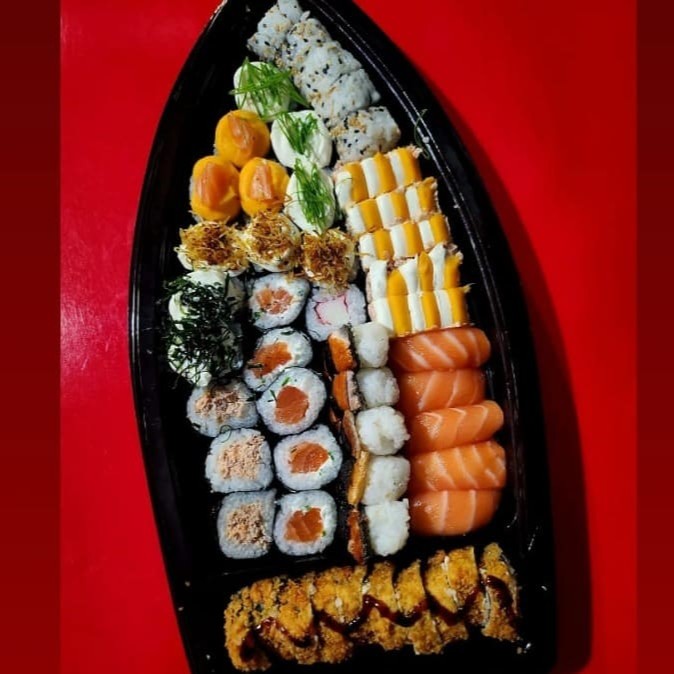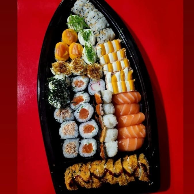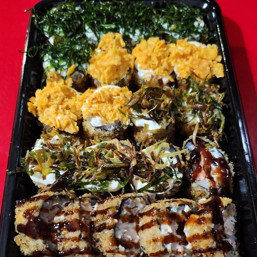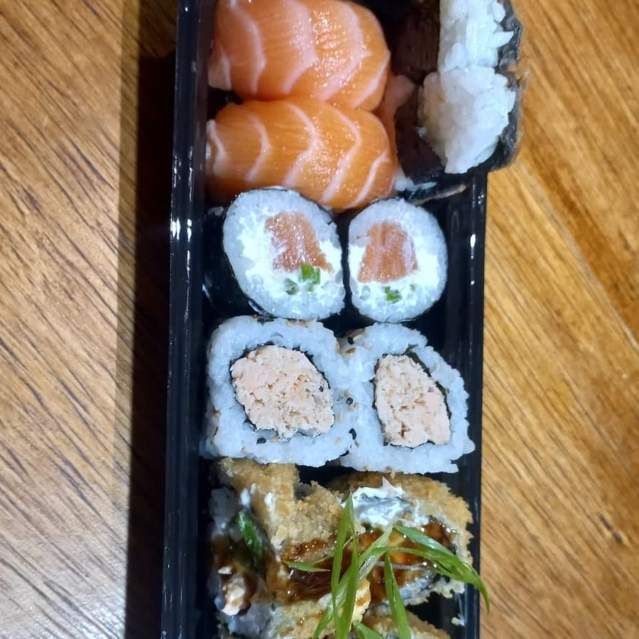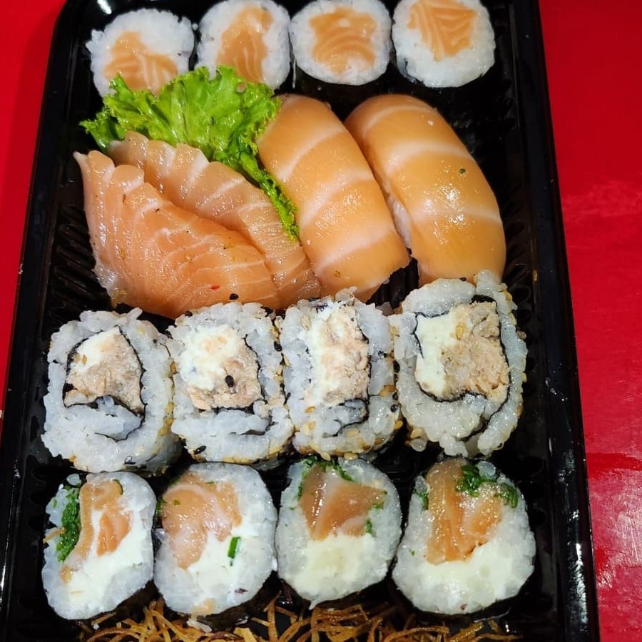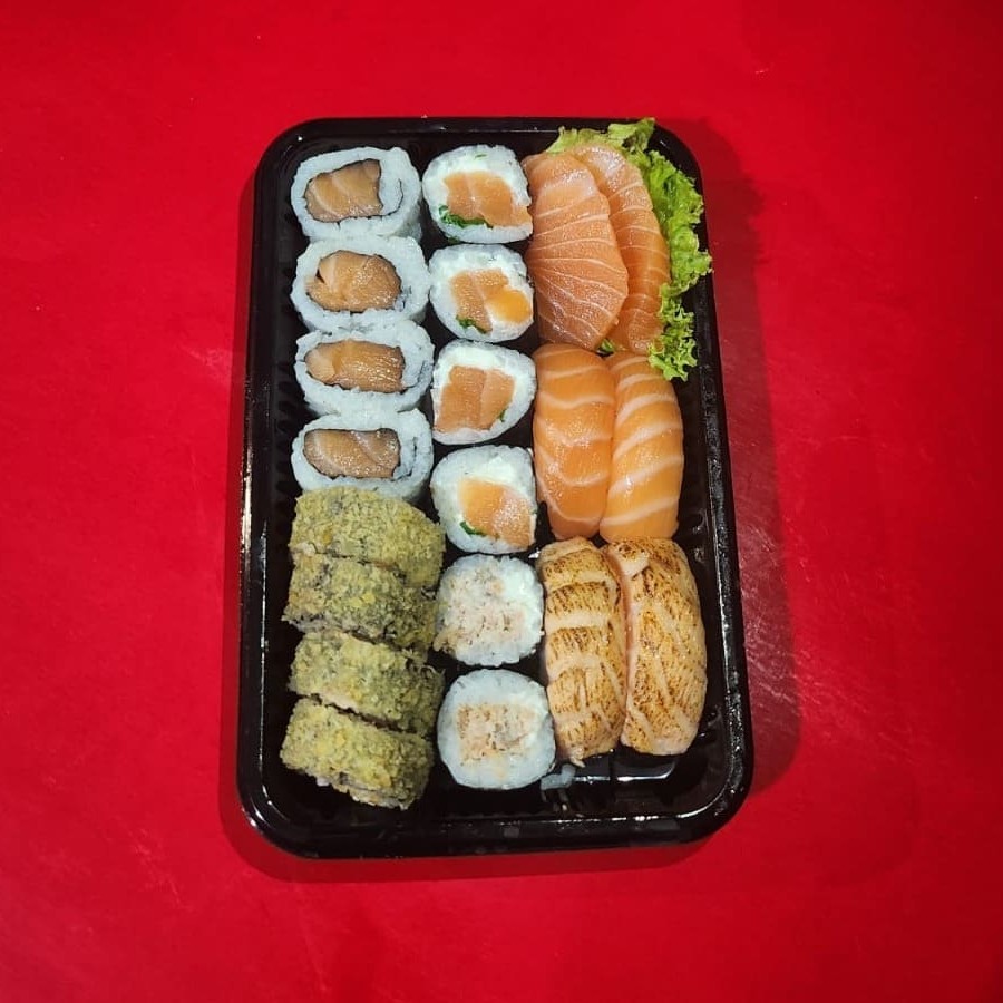 2 niguiri salmão, 2maki kani, 2 maki philadelfia,4 niguiri skin, 4 tortinha e 2uramaki grelhado,4 hot (podendo ir peças variadas) *Acompanha 1 hashi, 2 sachês de shoyu e 1 de teriaki.