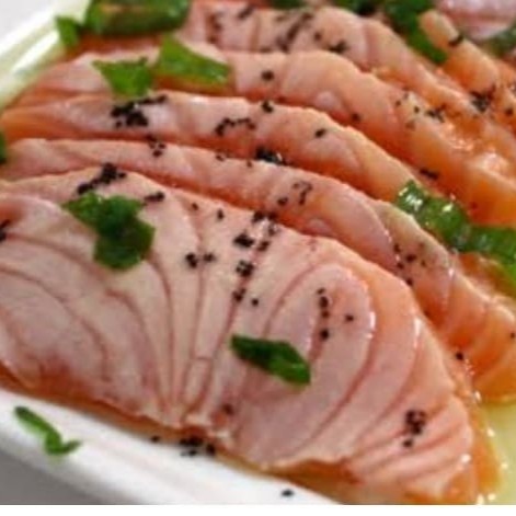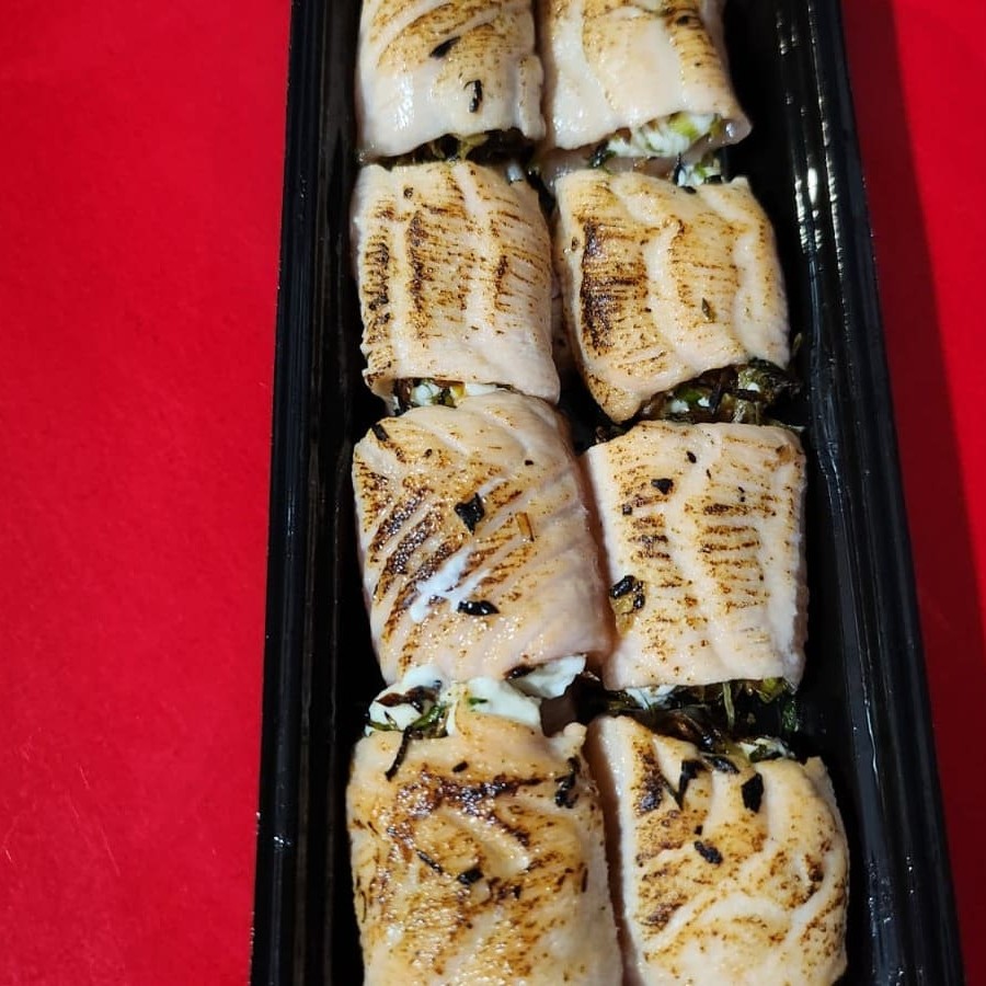 Lâmina de salmão maçaricado, envolvendo creeam cheese ao molho teriaki e cebolinha **Acompanha 1 hashi, 2 sachês de shoyu e 1 de teriaki.