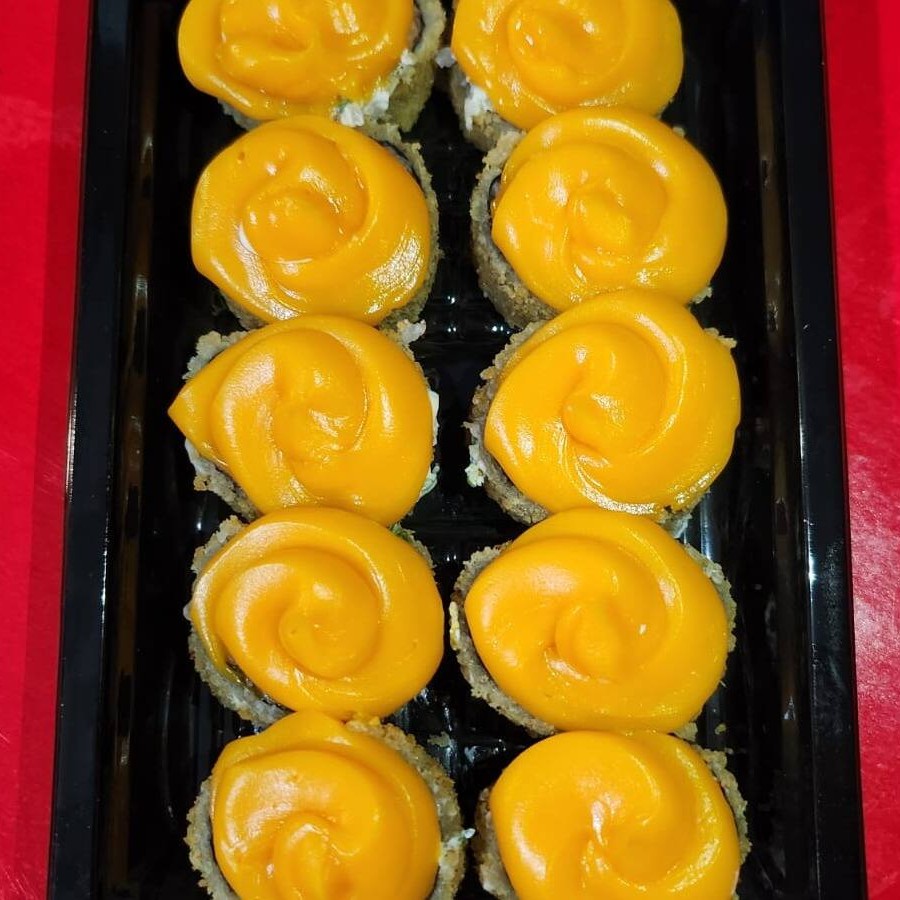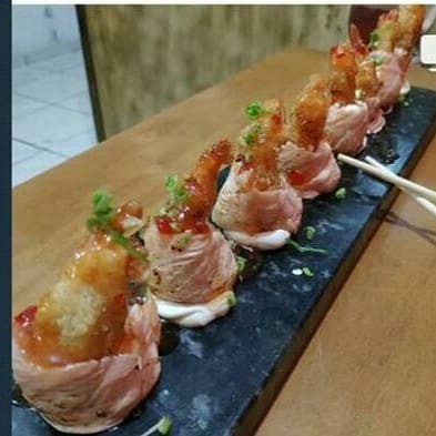 6 Lâminas de salmão envolvendo cream cheese e camarão empanado com geléia de pimenta **Acompanha 1 hashi, 2 sachês de shoyu e 1 de teriaki.