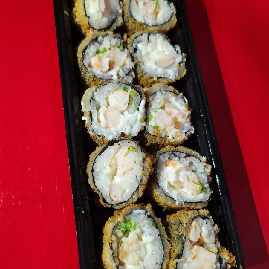 Alga, arroz japonês, salmão, cebolinha, creeam cheese, empanado na farinha panko e frito. Finalizado com camarão **Acompanha 1 hashi, 2 sachês de shoyu e 1 de teriaki.