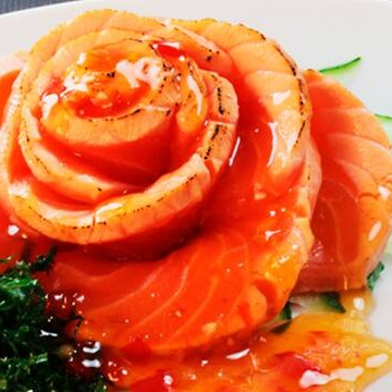 lâmina de salmão maçaricado, Tempero especial e Geléia Swit.