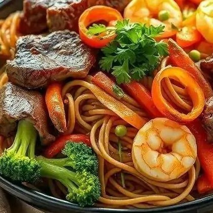 Camarão, frango, bovino e Legumes.