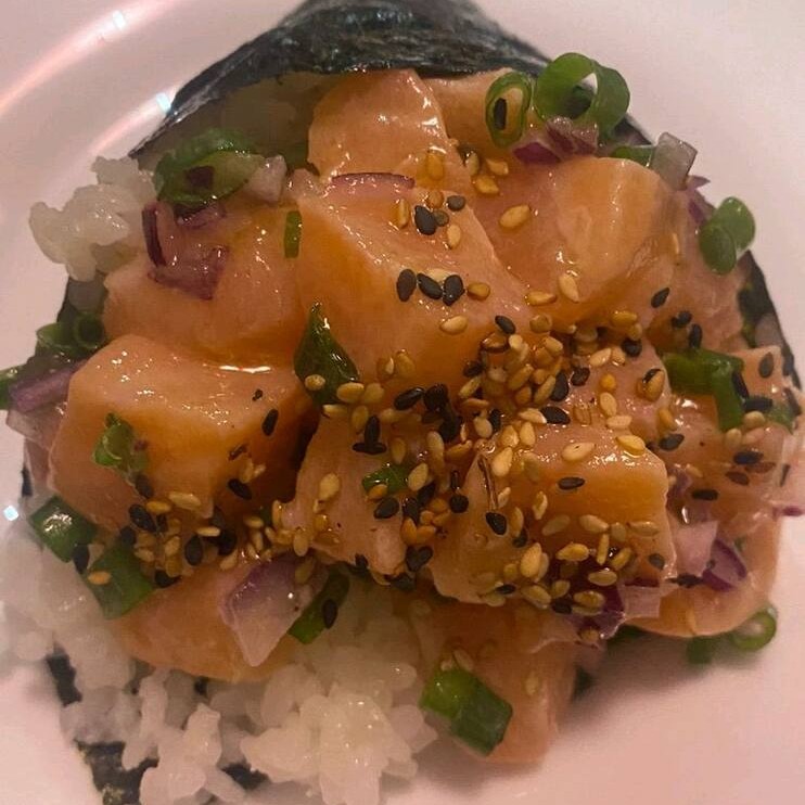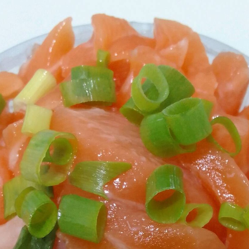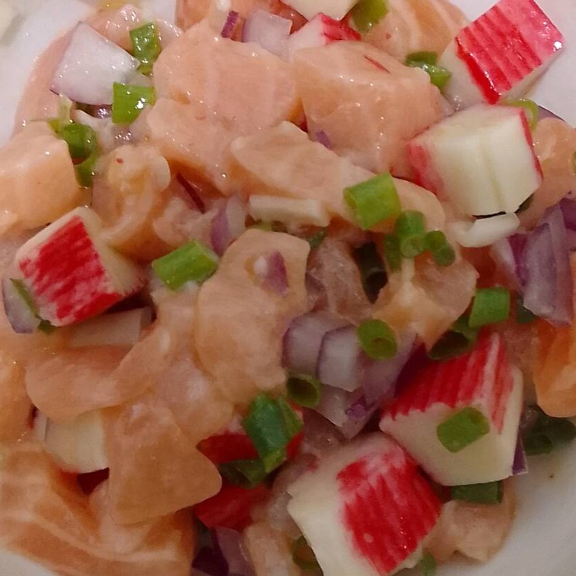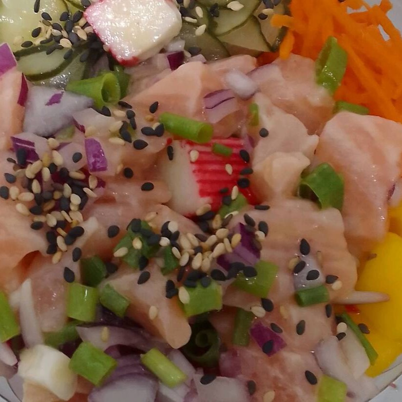 Acompanha salmão,kani,cebola roxa,cebolinha,limao,azeite,sal e gergelim.