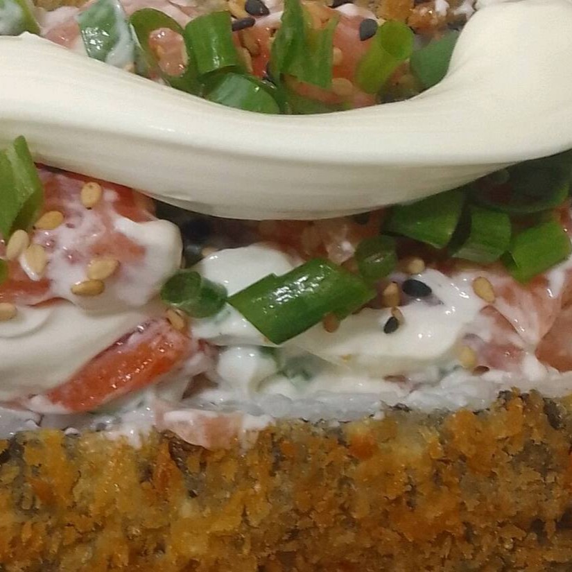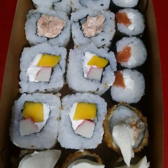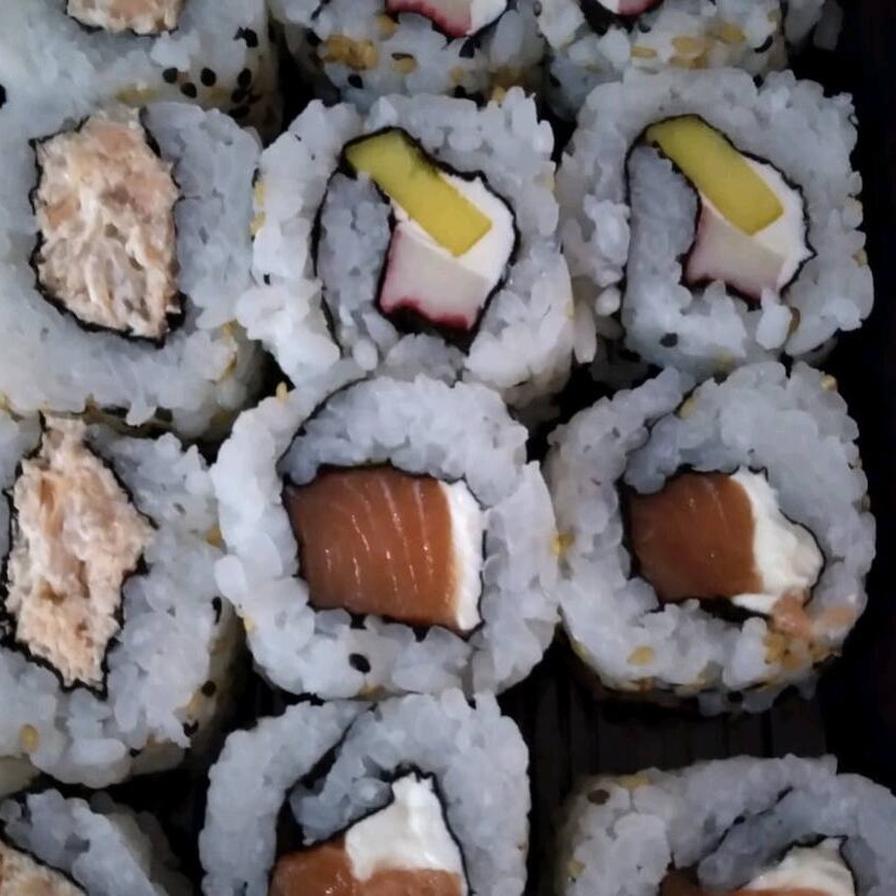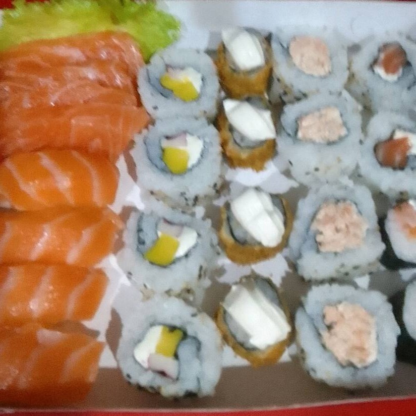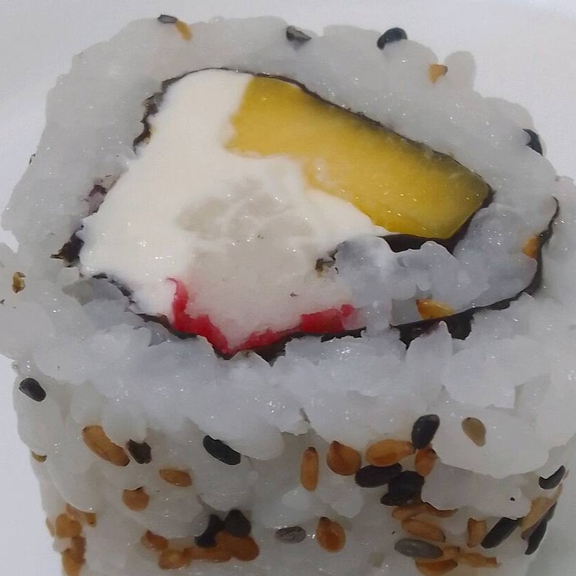 Acompanhado de arroz salmao,kani,manga,cenoura,tomate cereja e sunomono..Opção cream cheese.