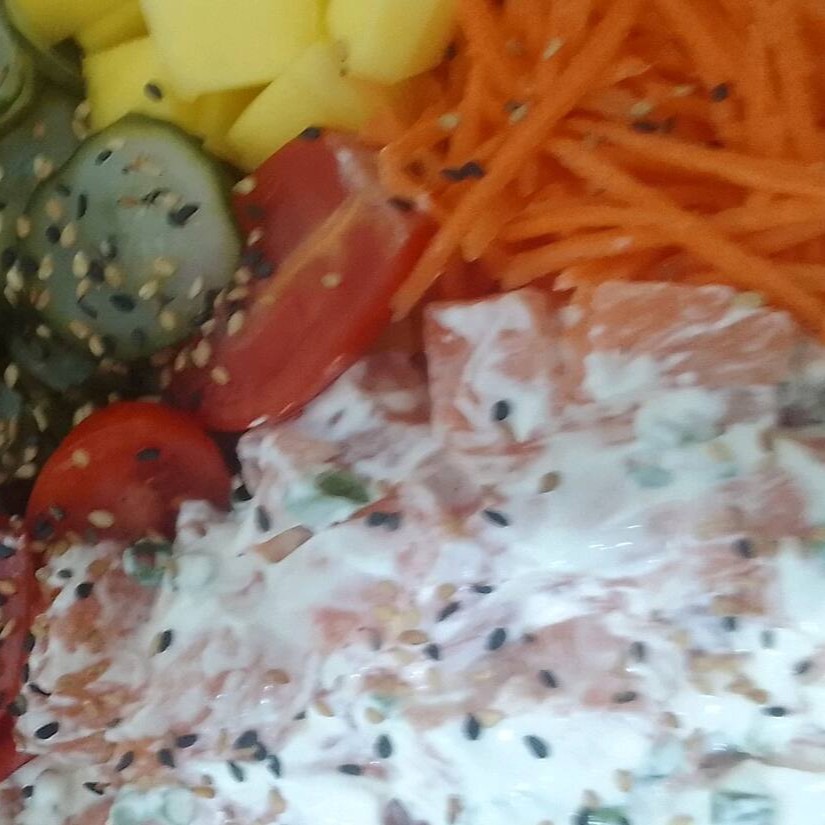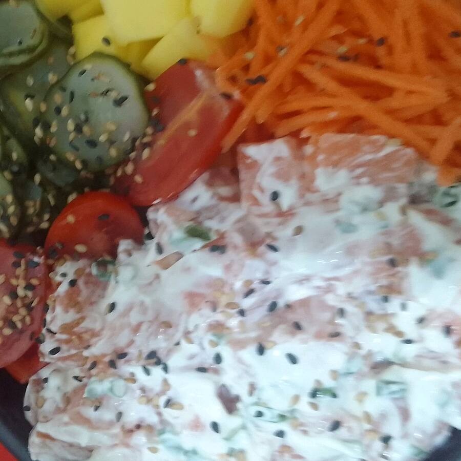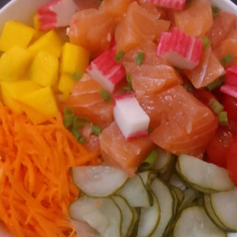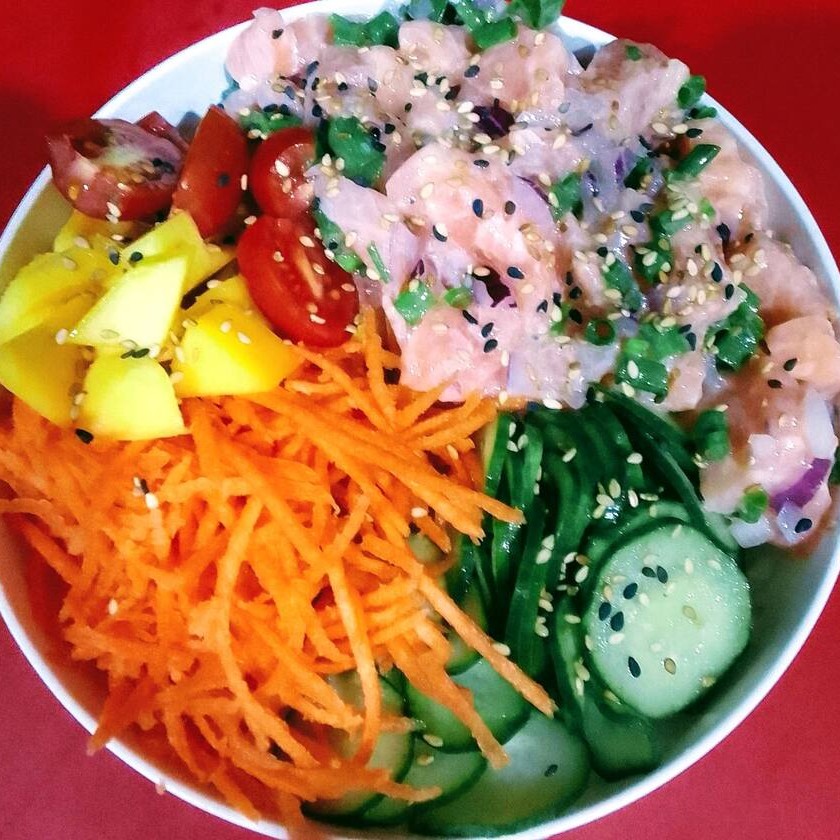 Delicioso Poke Acompanhado Com Cenoura,Sunomono, Manga,amendoim, Tomate e com arroz japonês..