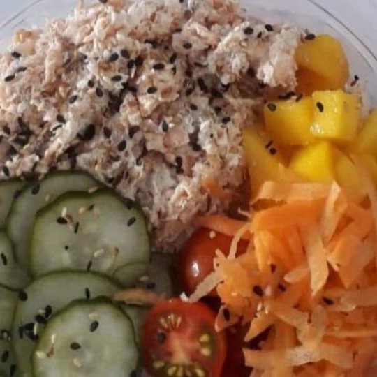 Acompanha Arroz,salmão,manga em cubos,tomate cereja,cenoura,Sunomono,kani,cebola roxa,cebolinha,limão,azeite,gergelim e amendoim..