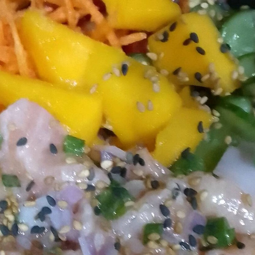 Delicioso Poke Acompanhado Com Cenoura Sunomono, Manga,amendoim,Tomate e com arroz japones..