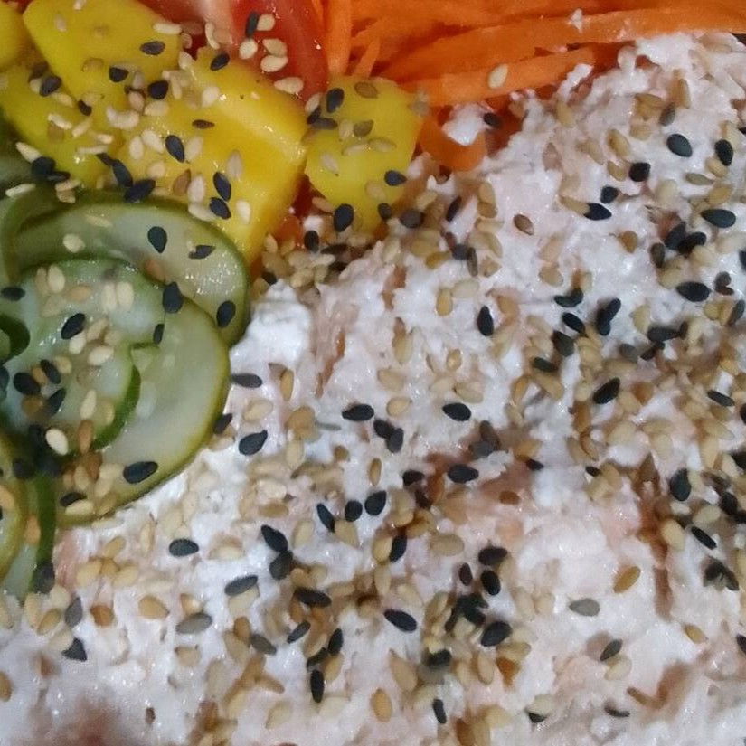 Acompanha salmao grelhado com cream cheese,gergelim e cebolinha..