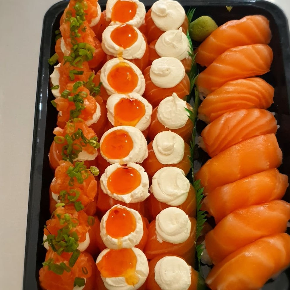 2 niguiri salmão 2 niguiri skin 2 niguiri kani 5 maki california 5 uramaki salmão grelhado