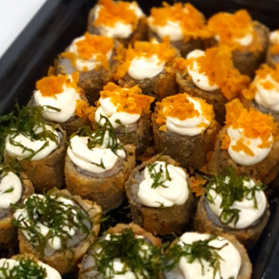 Arroz alga salmão creme chesse cebolinha empanado na farinha panko e frito