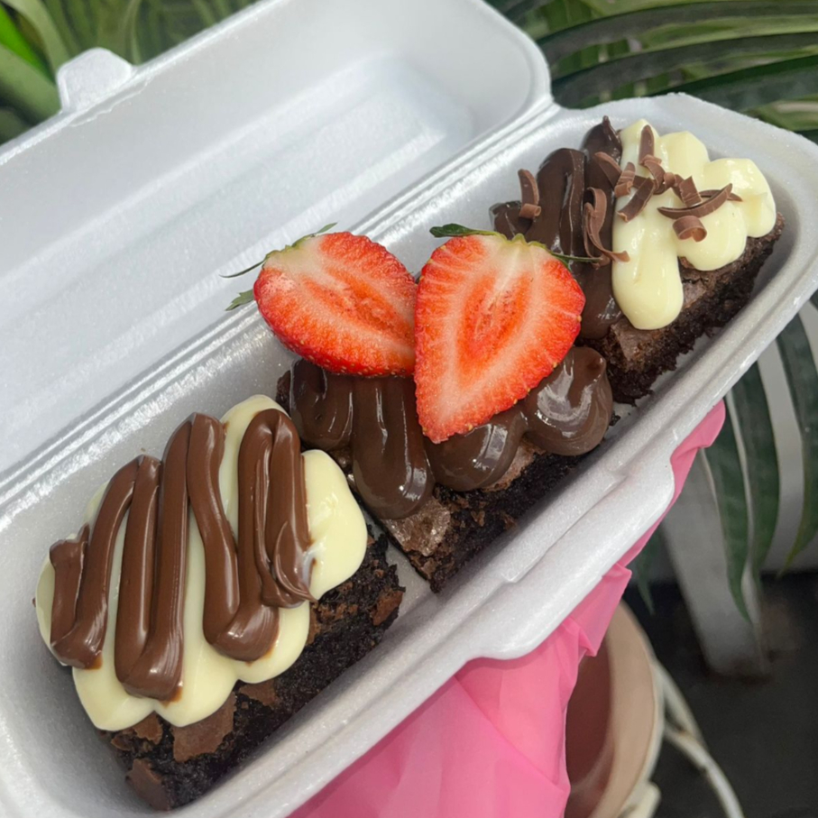 Acompanha 3 quadrados de brownie sendo 1 ninho com Nutella, 1 brigadeiro de chocolate com morango 1 dois amores (ninho e chocolate preto) com raspas de chocolate