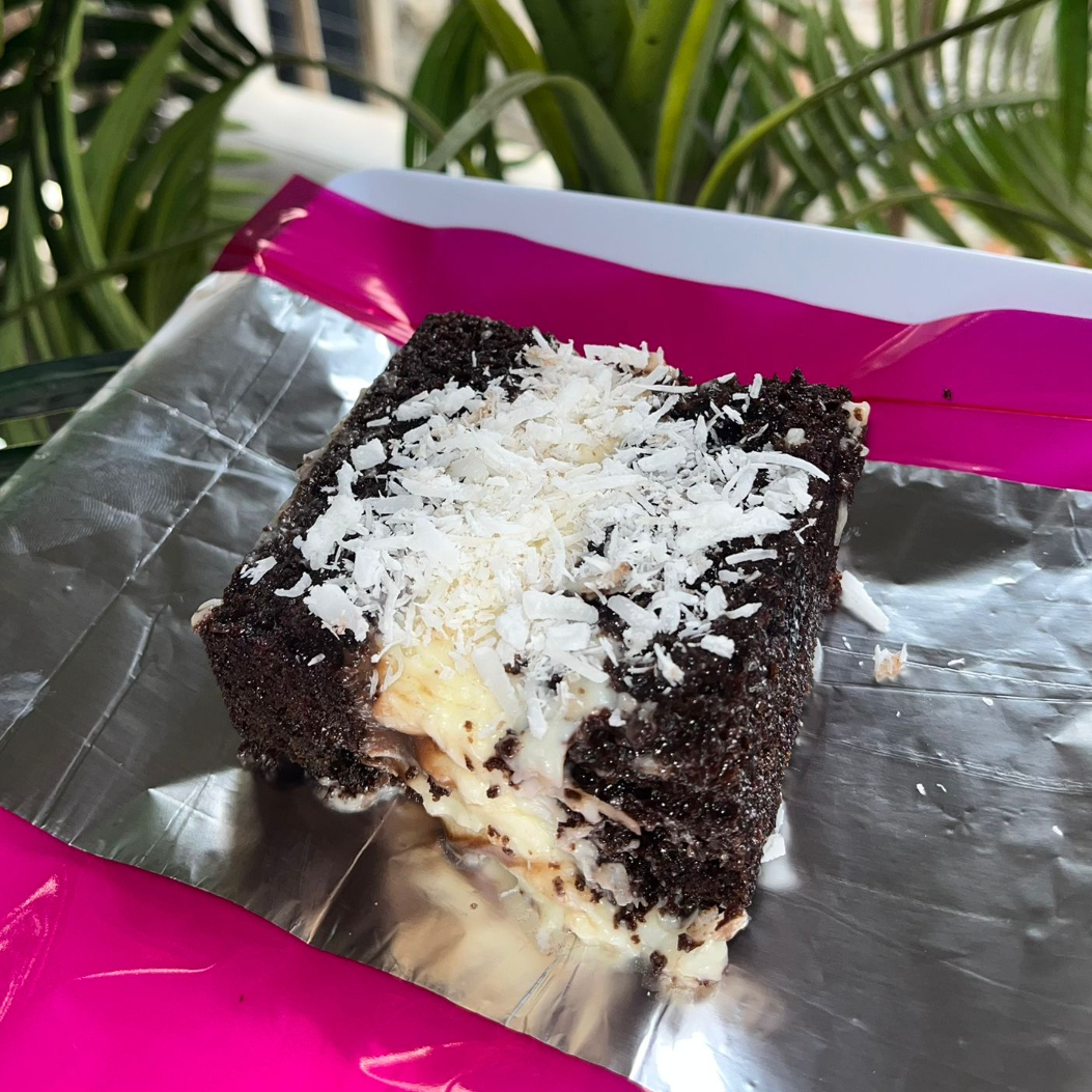 Massa de chocolate 50% cacau, recheio cremoso de coco com ganache de chocolate ao meio, finalizado com coco ralado por cima.